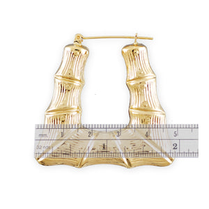 These 10k real gold puffed hollow square door knocker bamboo earrings are 1 7/8 inch wide, making them popular in today's fashion trend reminiscent of the 80s. Sold in pairs (2 earrings per set) in the USA, these earrings are made of 100% 10kt yellow gold and have secure clip enclosures. The clip enclosures ensure an easy, comfortable fit.