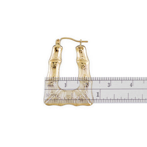 These 10kt Gold Rectangular Door Knocker Bamboo Earrings boast a 1-inch tall and feature a secure clip enclosure. Relive the 80's with these popular earrings, offered in pairs per set and crafted in the USA with 100% 10kt yellow gold Wear a modern take on a classic look. The secure clip enclosure ensures these earrings will stay in place while you're out and about.